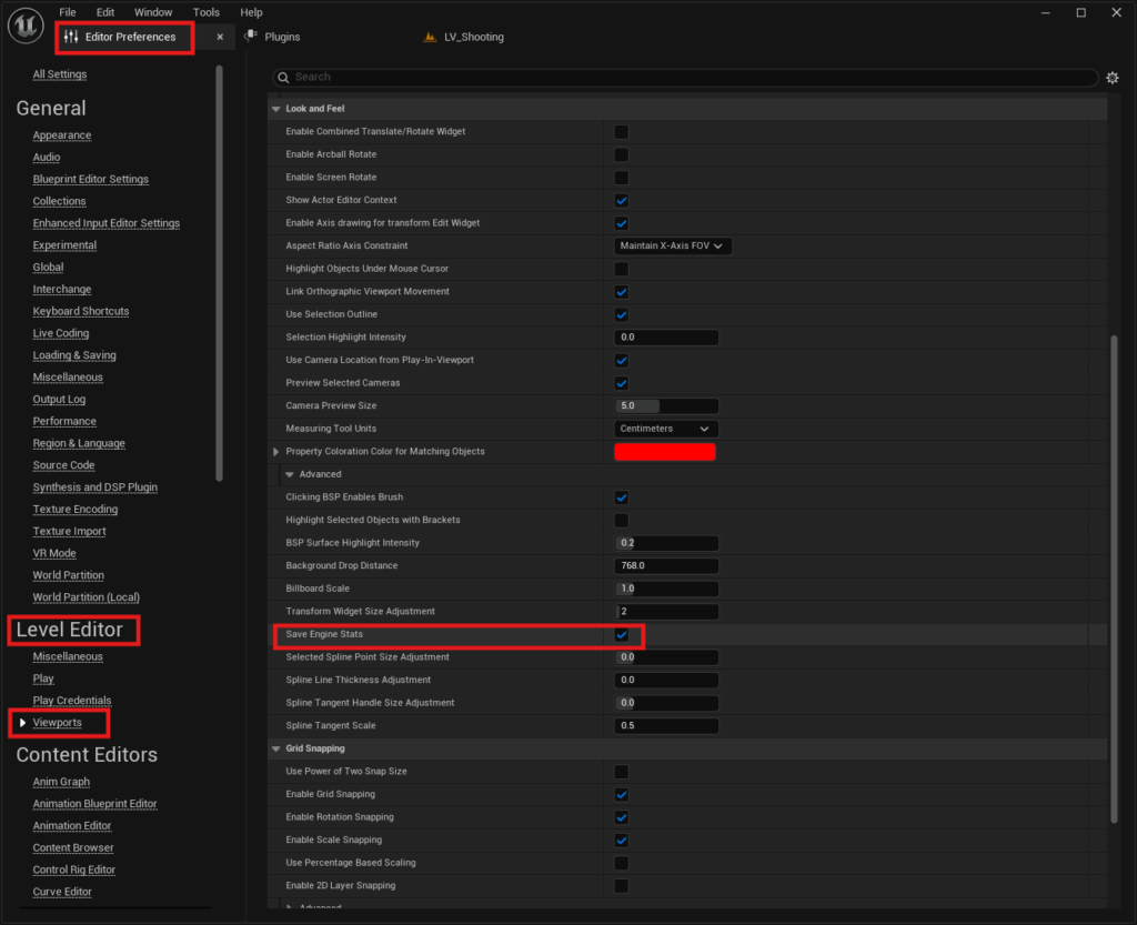 「Editor Preferences」>「Level Editor」>「Viewports」>「Save Engine Stats」を