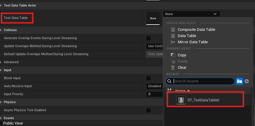 TObjectPtr<UDataTable>の変数を持つATestDataTableActorを用意